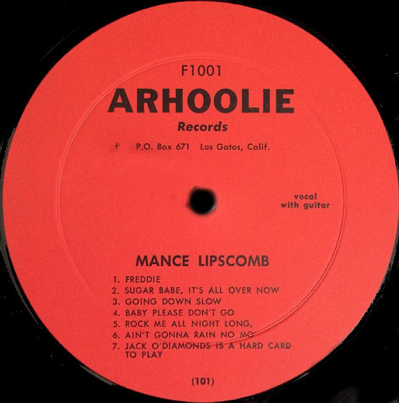 The Arhoolie labels were red with black print. The first album had no graphics (design #1, far left). Starting with F-1002 and continuing to 1964 (F-1016), there was a black field on the top half of the label with the Arhoolie guitar logo (design #2, center left). In 1964, the black field was reduced to about half the size and the guitar changed to red (design #3, near left). Promotional labels were white with black print with the same design. |