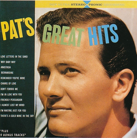 | DOT/MCA (US): MCAD-10885 - Greatest Hits - Pat Boone [1993] Two Hearts (M)/Ain't That A Shame (M)/I'll Be Home (M)/I Almost Lost My Mind (M)/Friendly Persuasion (Thee I Love) (M)/Chains Of Love (M)/Don't Forbid Me (M)/Why Baby Why (M)/Love Letters In The Sand (M)/Bernardine (M)/Remember You're Mine (M)/Remember You're Mine (M)/April Love (M)/A Wonderful Time Up There (M)/It's Too Soon To Know (M, slight hiss)/Sugar Moon (M)/If Dreams Came True (M)/Moody River (S)/Speedy Gonzales (S) |