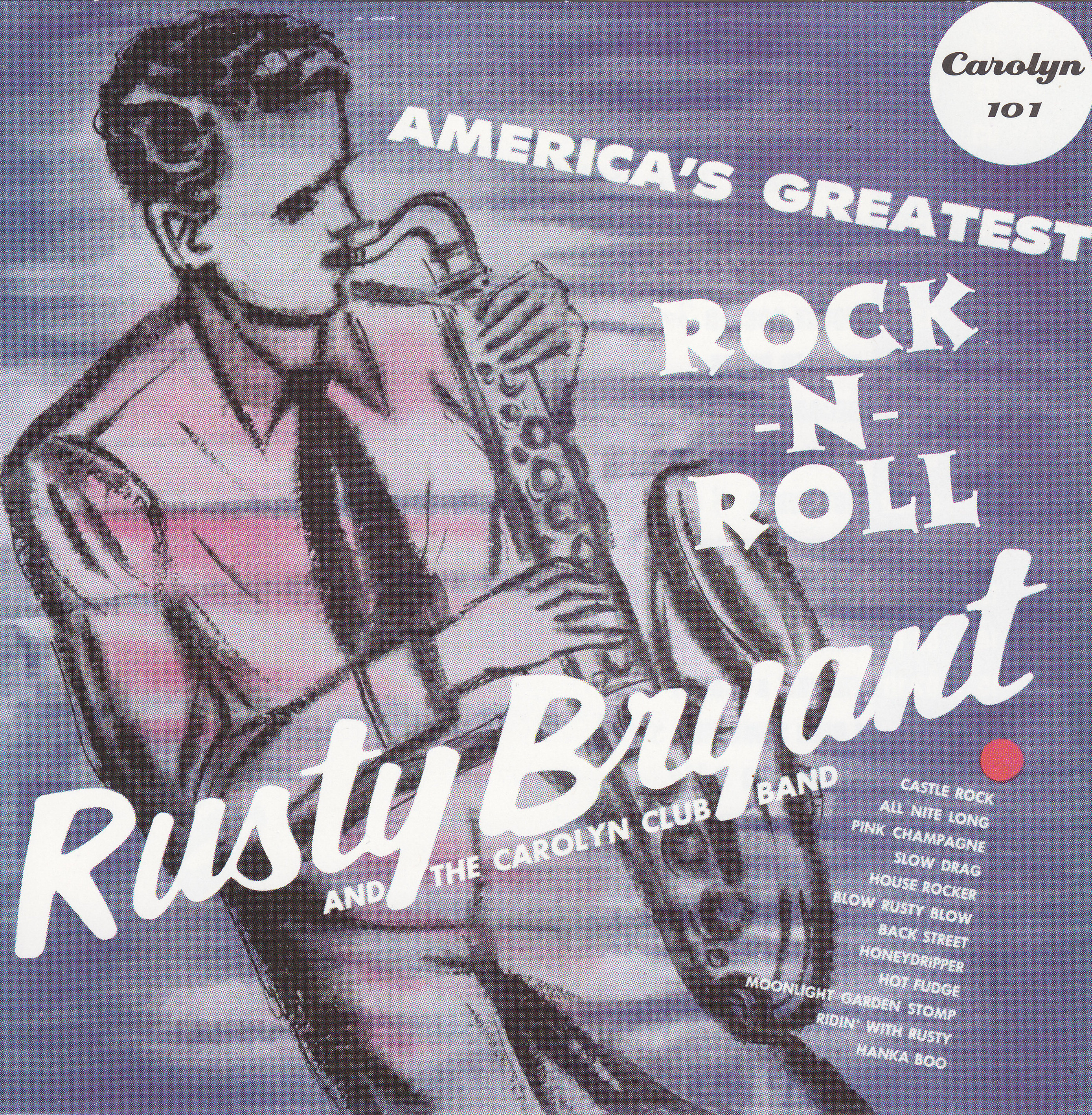 CAROLYN (US) 101 - America's Greatest Rock -N- Roll - Rusty Bryant & The Carolyn Club Band [1999] A compilation of eleven of Rusty's Dot singles, plus an album track. All tracks monaural. All Nite Long/Castle Rock/Pink Champagne/Slow Drag/Blow Rusty Blow/Merry Go Round/House Rocker/Danger Blues/Record Delivery Blues/Back Street/Hot Fudge/Ridin' With Rusty/Moonlight Garden Stomp/Honeydripper/Frankie & Johnny/I Need Someone/Hanka Boo/Foot Stompin'/Don't Tell Me/Honky Tonk, Part 2/Lonely Cryin' Heart/Kittyhawk, Part 2/Little Hawk's Walk |
